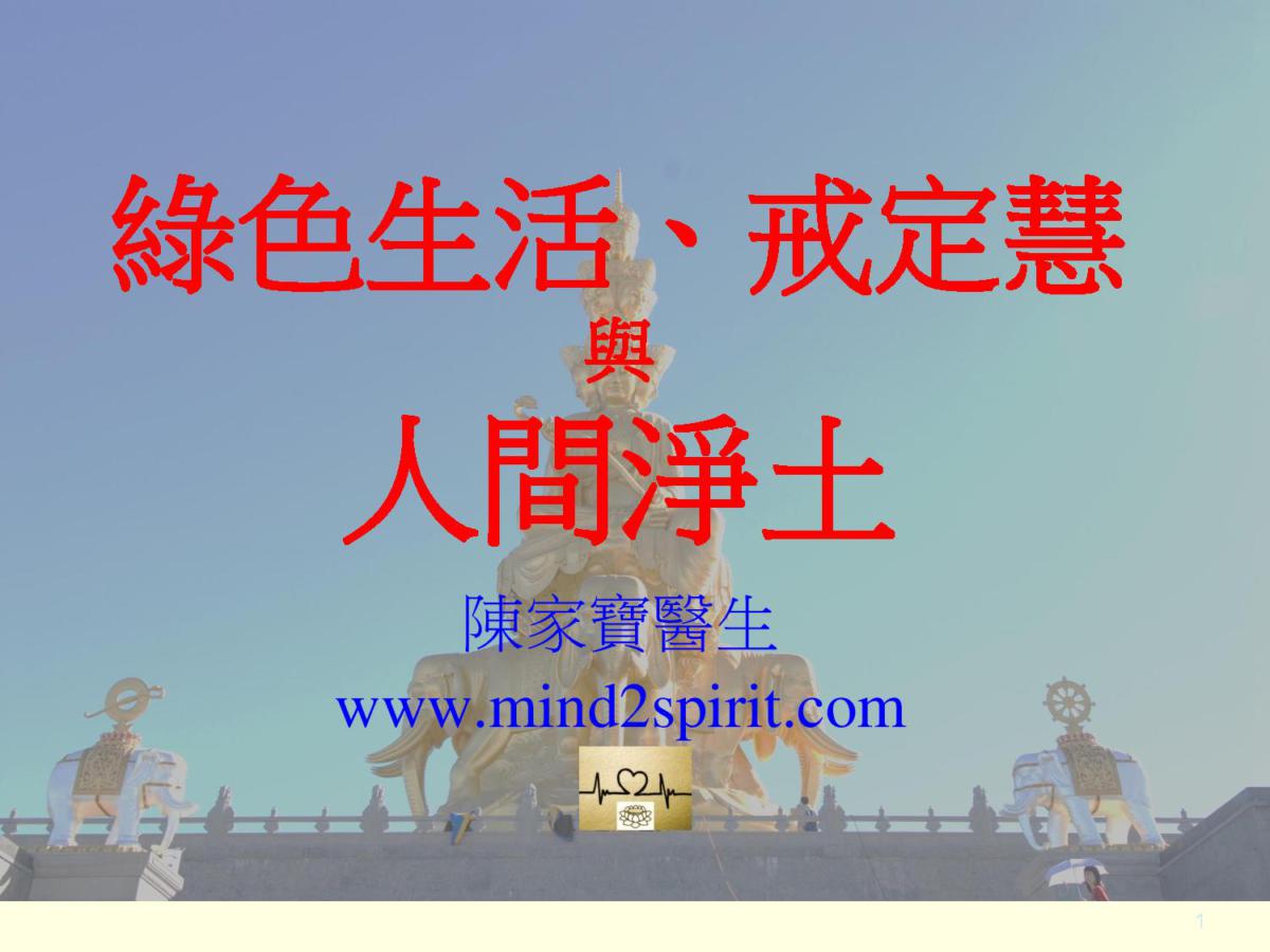 綠色生活、戒定慧與人間淨土 2016 年 4 月 21 日 陳家寶 講座重溫 Powerpoint 下載 綠色生活、戒定慧與人間淨土!這個講座將帶領你進入一個綠色、平衡和有意義的生活方式,結合佛教的戒定慧教導,助你在當下中創造人間淨土。 我們相信與自然和諧相處,對環境負責任是重要的價值觀。我們將分享綠色生活的實踐方法,包括可持續發展、節能減廢和自然食物的選擇,以促進個人和地球的健康。 同時,我們將融合佛教的戒定慧教導,探討培養內在平靜和智慧的方法,並將其應用於日常生活中。透過冥想、正念和內觀的實踐,你將能夠提升自我覺察、培養內在的和平與喜悅,並創造更有意義的人間淨土。 加入我們,一同追尋綠色生活、戒定慧與人間淨土!