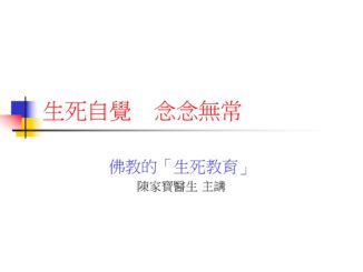 講座重溫 生死教育 2005 2005 年 8 月 4 日 陳家寶 佛教的生死教育!這個講座將帶領你深入探索佛教對生死的智慧教導,助你建立對生命和死亡的深刻體悟。 佛教教導我們生死是不可避免的一部分,並提供了寶貴的指導,幫助我們面對生命的轉變和不確定性。我們將分享佛教的生死教育,包括死亡觀、生命價值、後世和輪迴的理解,以及如何以智慧和慈悲的心境迎接生死的挑戰。